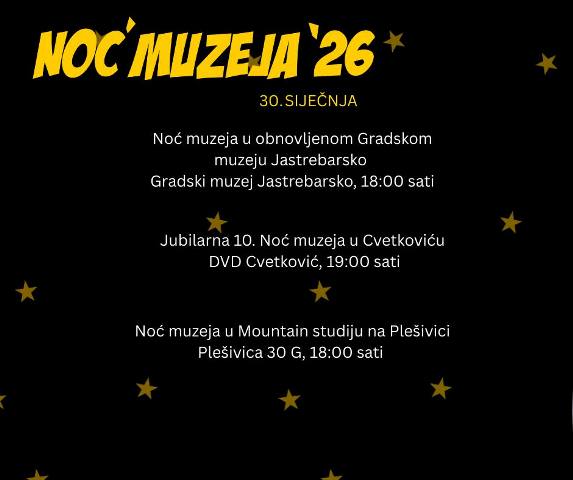 Noć muzeja koja se održava posljednjeg petka u mjesecu ove će se godine u Jastrebarskom obilježiti na čak tri lokacije. Iznimno zanimljiv program priprema Gradski muzej Jastrebarsko, jubilarna 10. Noć muzeja održat će se i u Cvetkoviću, a po prvi puta uključuje se umjetnica Marina Stoponja koja će te večeri otvoriti vrata svog ateljea na Plešivici