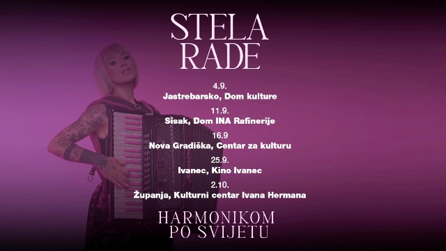 Nakon što je osvojila publiku i žiri u showu Tvoje lice zvuči poznato te ponijela prestižnu regionalnu nagradu Balkan Award for the Greatest Musical Talent of the Year, Stela Rade odlučila se predstaviti publici širom Hrvatske turnejom zanimljivog naziva “Harmonikom po svijetu” na kojoj će posjetitelji njezinih koncerata moći uživati u autorskim pjesmama i svježim interpretacijama poznatih hitova, sve s prepoznatljivim Stelininim potpisom.