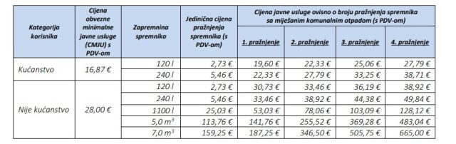 Cijena odvoza otpada iznosit će: