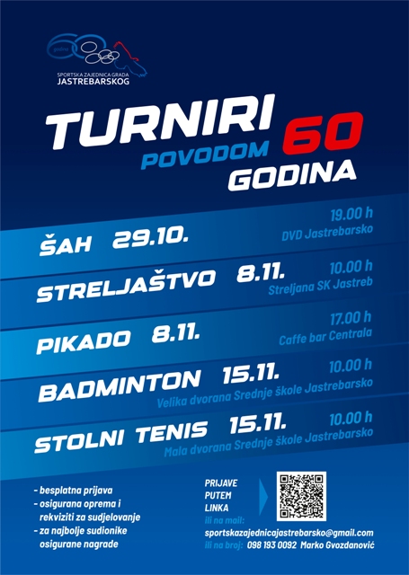 – STOLNI TENIS – 15.11., početak 10.00, mala dvorana Srednje škole Jastrebarsko u suradnji sa STK Jaska.