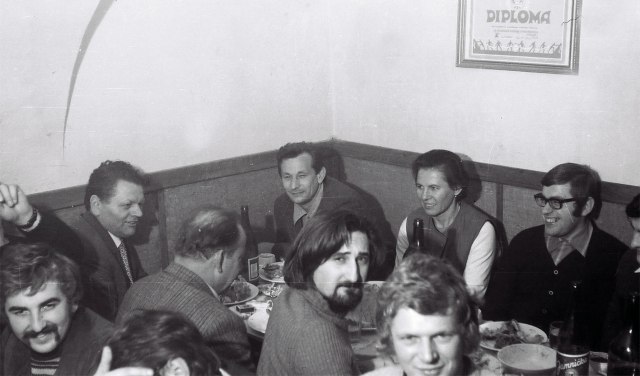 Početak jaskanskog kazališta u prostorijama DVD-a Jastrebarsko 1968. Te je večeri Nino Škrabe sa Stjepanom Preprotićem i prijateljima dogovorio početak rada jaskanskog kazališta. Tahir Mujičić na sredini fotografije, Boris Senker je skroz desno (vidi mu se samo nos). Zbog ove večeri Nino Tahira i Borisa smatra kumovima jaskanskog kazališta, a na ovoj slici je i Nino Škrabe, vatrogasni dužnosnici Nikola Žunac i Ivica Marković te budući glumci kazališta u nastajanju, Dragutin Štetner i Mladen Budinšćak.